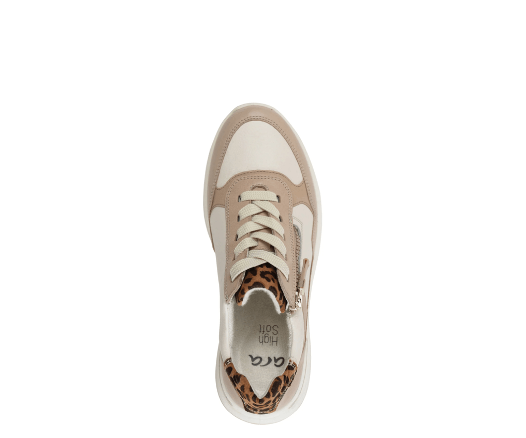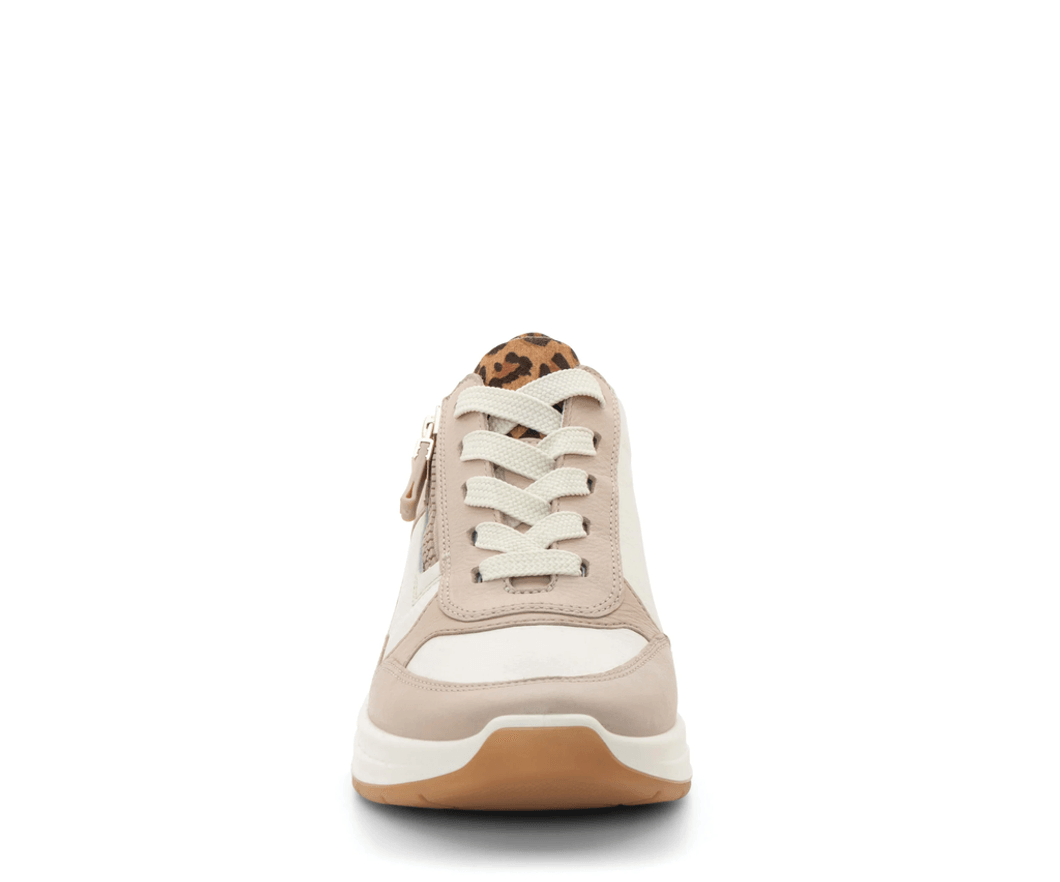 The Ara Shoes Gardenia Women's Zip Wedge Sneaker features a fun mix of shell, cream, and sand calf leather, complemented by biscuit suede and nature leo print. Available in sizes 5-11.5 (US) with a fitting of H (medium+), this sneaker is designed to accommodate various foot shapes comfortably. The wedge design not only adds height but also gives you that trendy, athletic vibe.