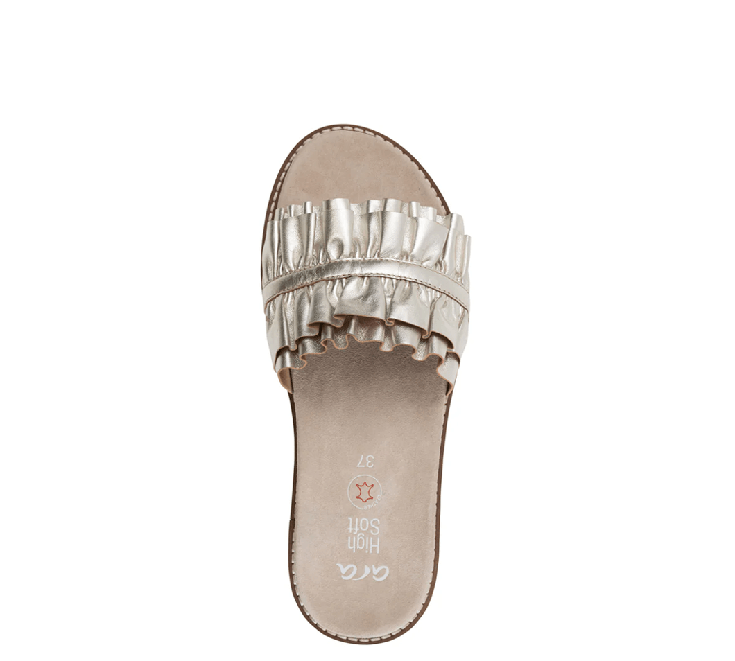 The Ara Shoes Keyes Women's Ruffle Slide Sandal - Platinum is crafted from premium platinum metallic calf leather, providing a luxurious feel and eye-catching shine. Available in sizes 35-43 (EU) with a G (medium) fitting, these sandals are designed to accommodate a variety of foot shapes comfortably.