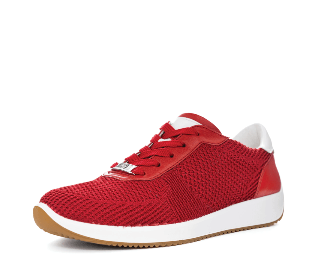 The Ara Shoes Lilly 3 Women's Stretch Sneaker features a unique wovenstretch upper that adapts to your foot shape, providing unparalleled comfort and support. The innovative Fusion4 technology offers soft cushioning, making each step feel effortless. Available in a vibrant red color, this sneaker combines sporty sophistication with functionality, perfect for both daily wear and active lifestyles.