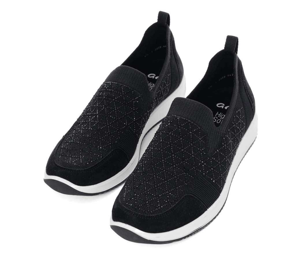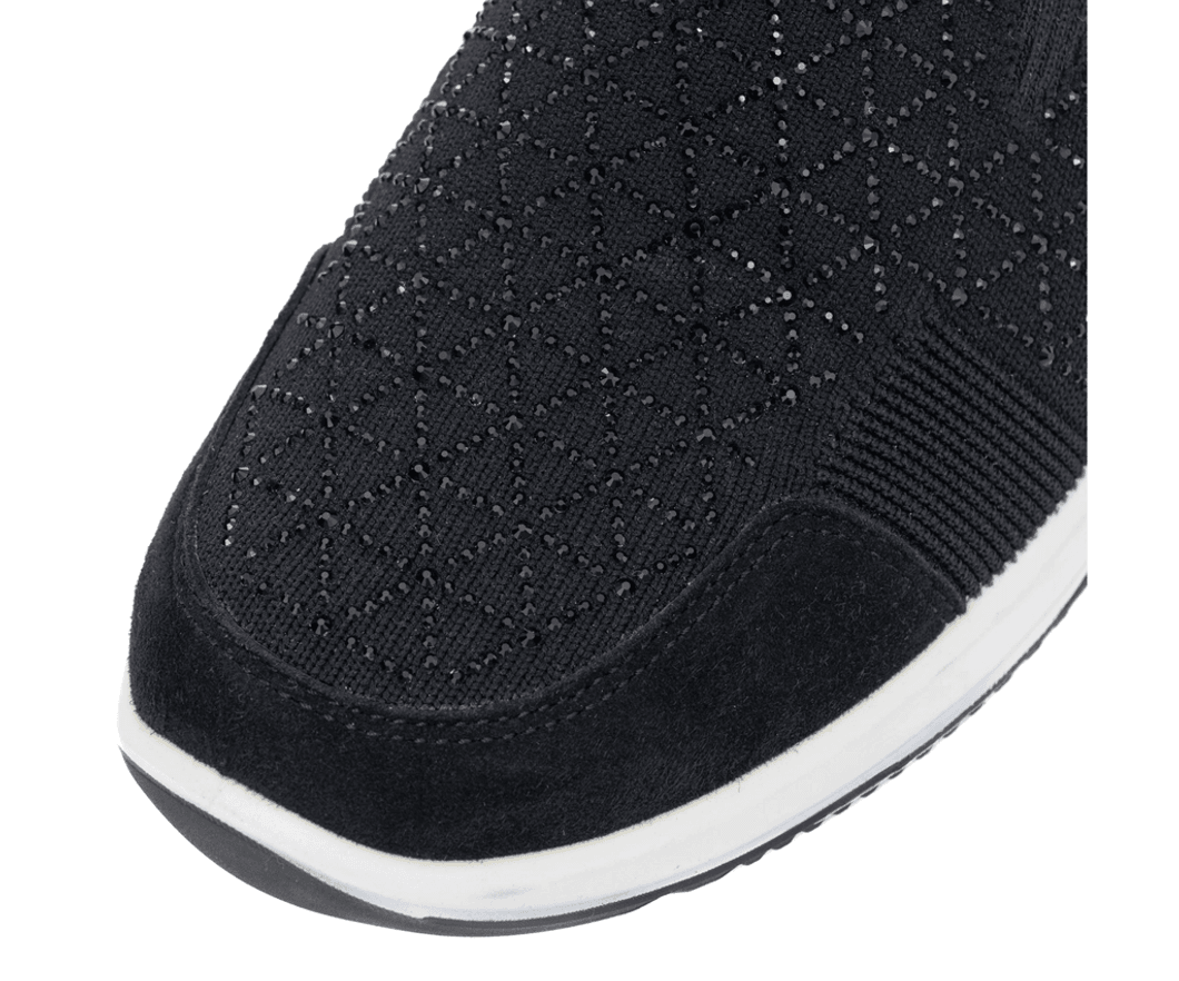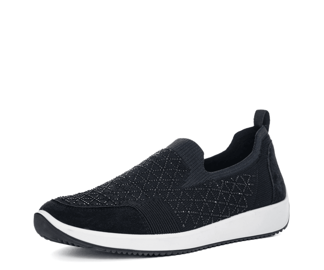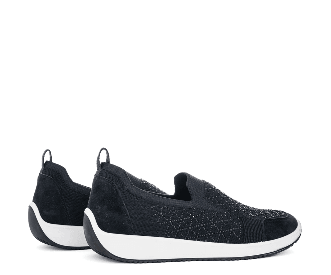 Don’t miss out on the perfect blend of style and comfort! Upgrade your footwear collection with the Ara Shoes Lisbon Women's Rhinestone Stretch Slip-on Sneaker - Black today and experience the difference. Order now and step out in confidence!