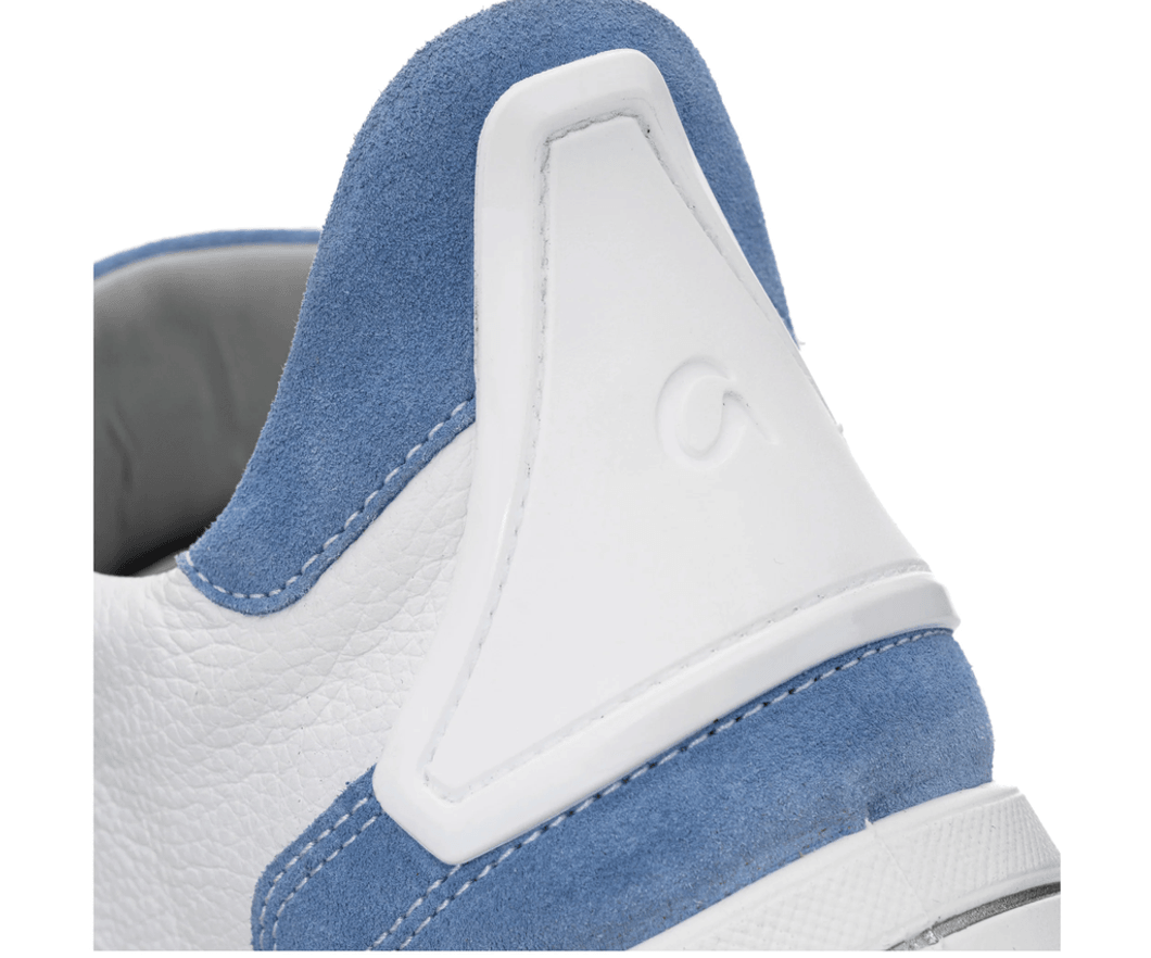 • Stylish Look: Featuring a sleek white calf leather with azure blue suede accents.