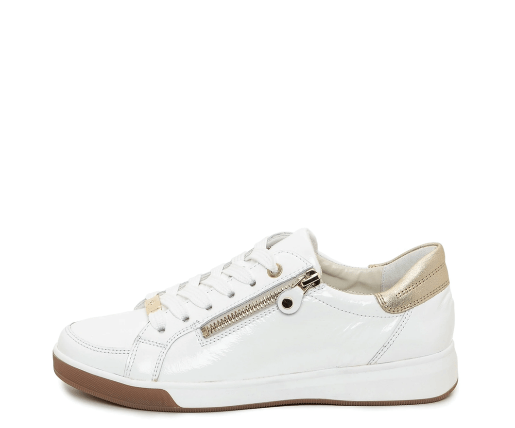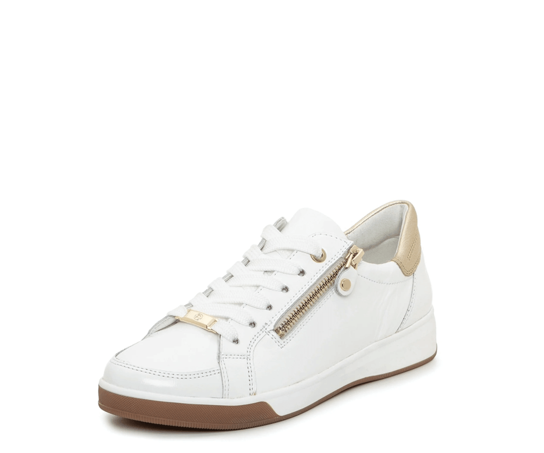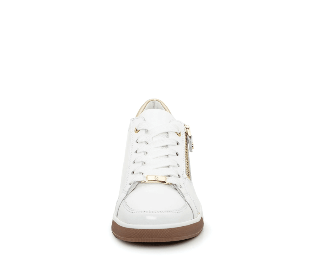 Step into style and comfort with the Ara Shoes Rei-Low Women's Zip Sneaker - White 83 12-34432-83. Designed for the modern woman, these sneakers are perfect for both casual outings and active days. With a sleek white patent finish and platinum accents, they add a touch of sophistication to any outfit.