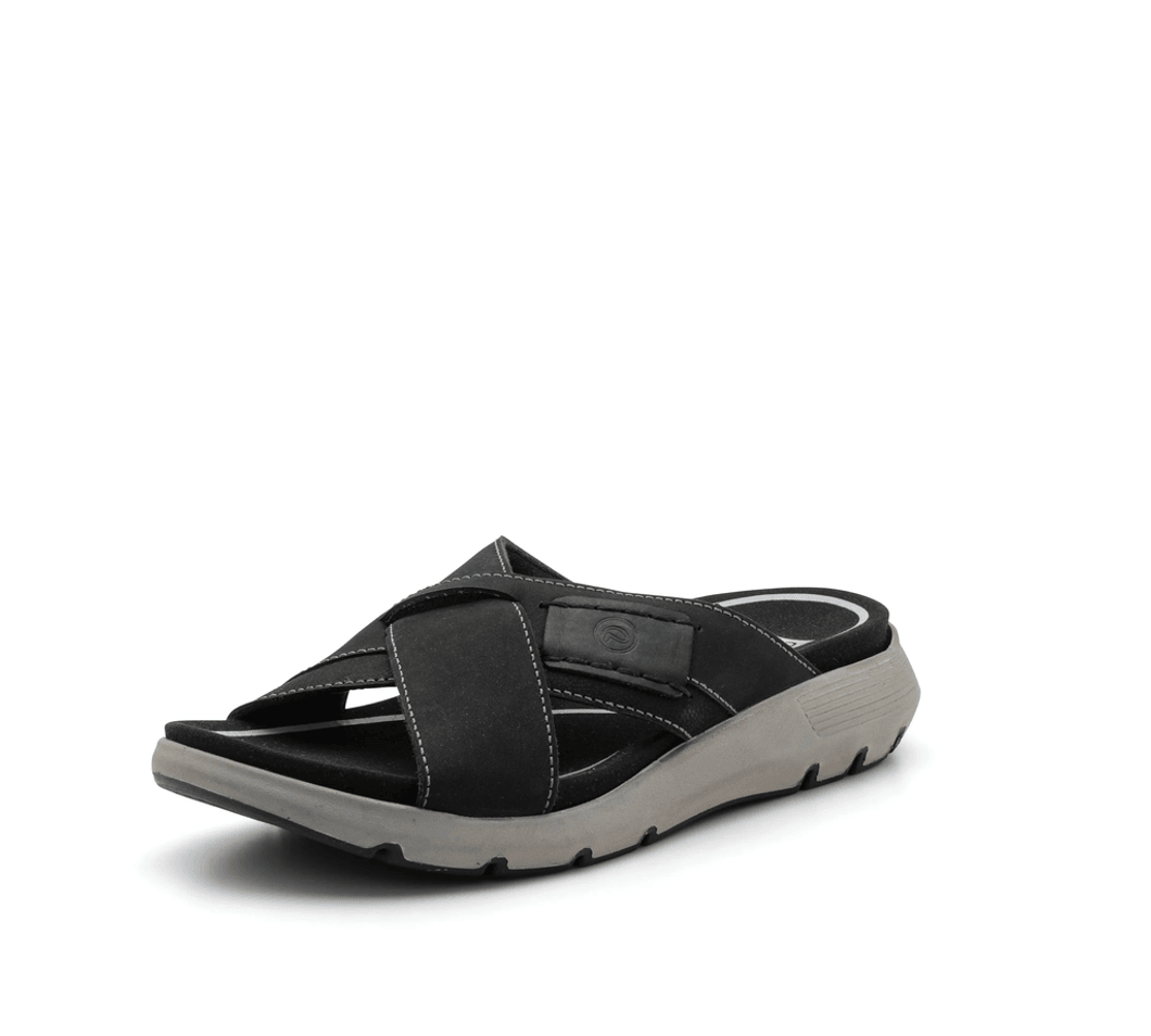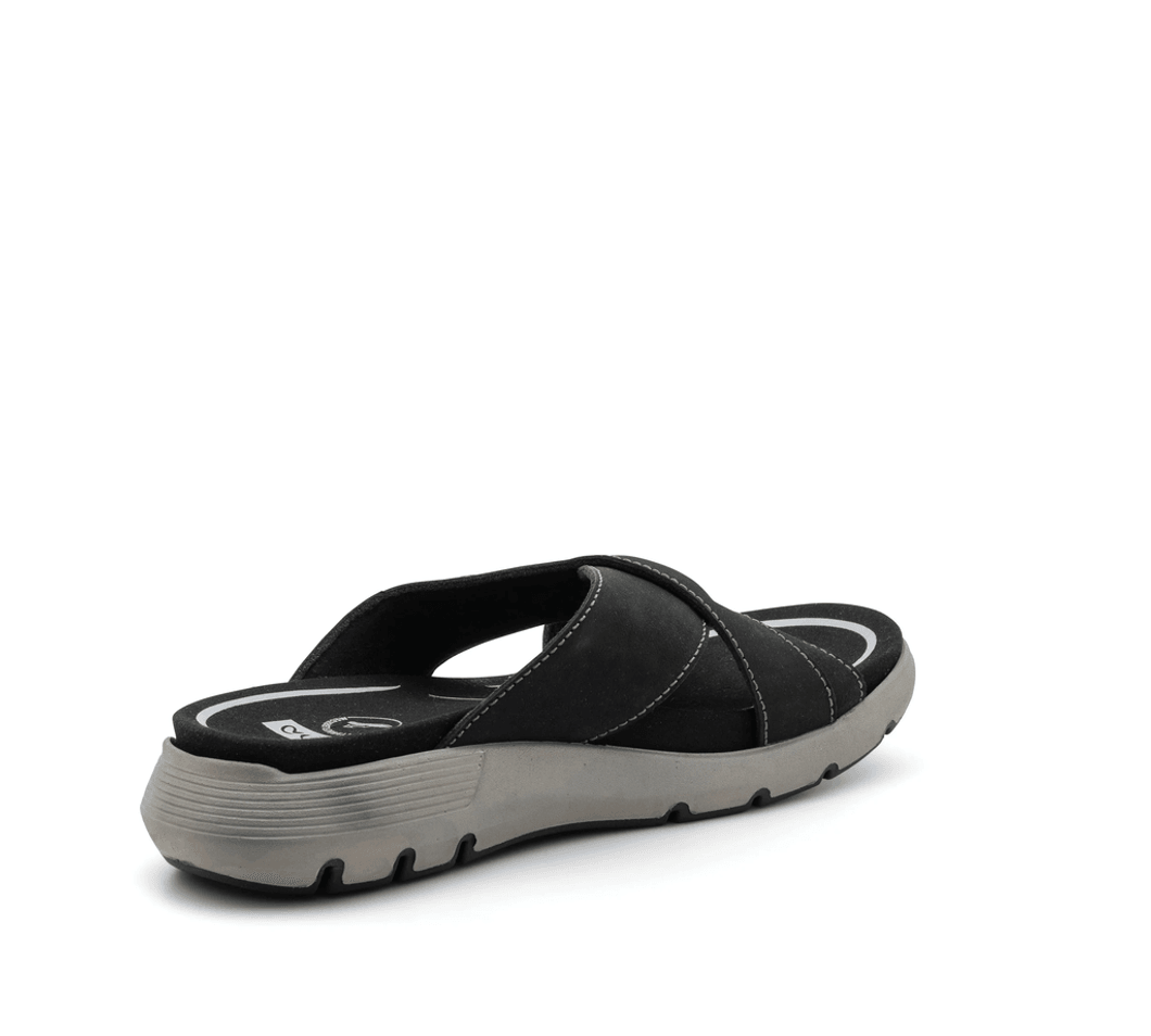 The Ara Shoes Santa Clarita Men's Cross-Strap Slide features a unique cross-strap design that not only enhances its visual appeal but also provides a secure fit. The soft nubuck material molds to your foot, ensuring maximum comfort throughout the day. With a stylish black finish, these slides easily complement any outfit, from shorts to casual trousers.