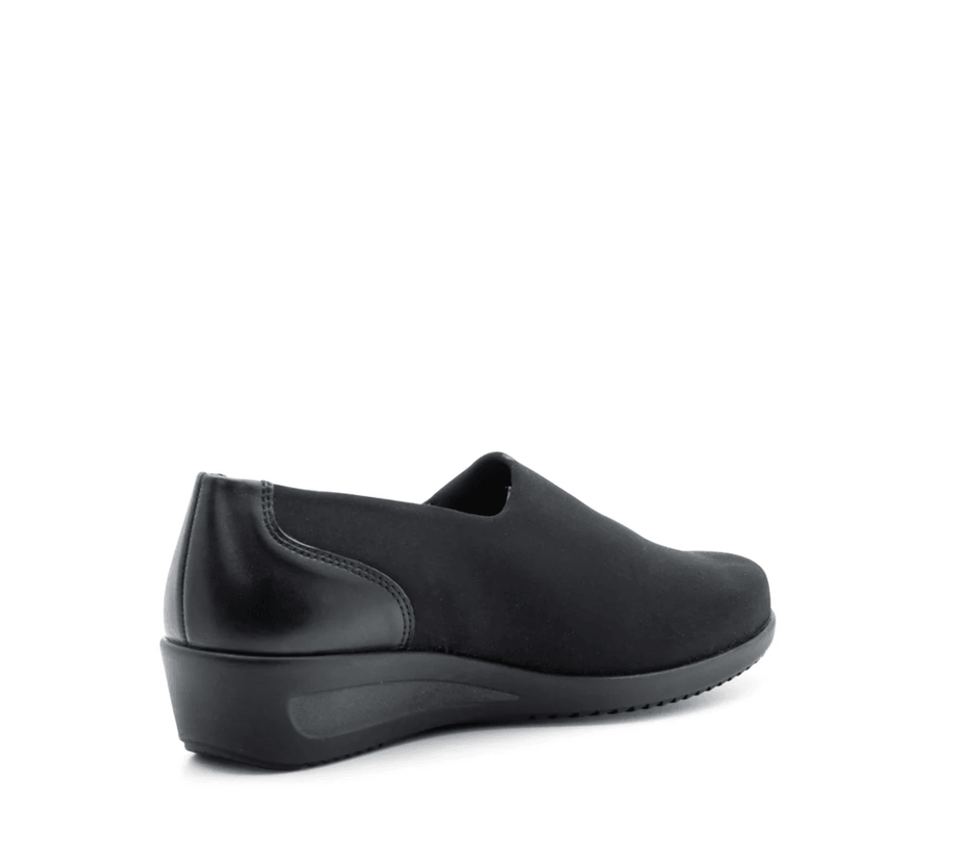 The Ara Shoes Zahara Women's GORE-TEX® Slip-On Wedge features a sophisticated black design crafted with high-quality hydro-fabric and hydro-nappa leather. With its unique Highsoft technology, this wedge combines smooth leather with a highly flexible outsole, delivering an indescribably comfortable walking experience. Perfect for both casual outings and professional settings, these wedges are available in sizes 5-10.5 (US) and fitting H (medium-wide).